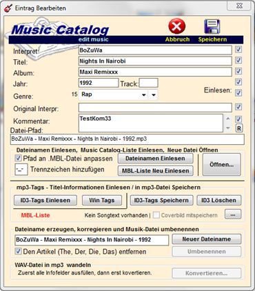Mit Music bearbeiten haben Sie hier die Möglichkeit die Einträge in der Datenbank zu ändern. Sie können den Namen der Musik-Datei auch gleich nach dem neuen Eintrag ändern. Aber auch die gespeicherten Musik-Tags in der mp3-Datei einlesen, ändern oder löschen. Ein Coverbild sowie Songtext kann ebenfalls mitgespeichert werden. WAV-Dateien können mit dem eingebauten Konverter in sehr hocher Quallität zu mp3 gewandelt werden. | |||