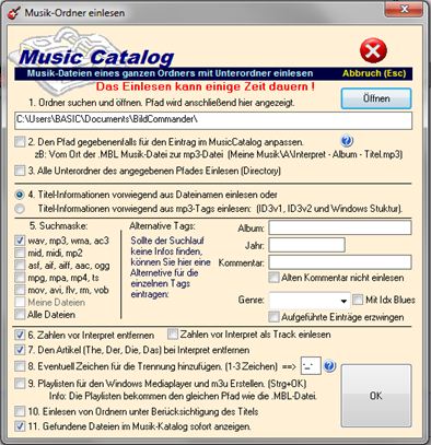 Mit Ordner einlesen wird nun die Musk eines ausgewählten Ordners nach Dateinamen, mp3-Tags und Windows-Tags nach einer ausgefeilten Methode nach Interpret, Album, Titel und Label Jahr eingelesen. Sie können auch Unterordner mit einlesen lassen. Eine Obergrenze an Dateien gibt es nicht (geprüft bis 100 000 Titel). | |||