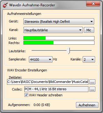 Hier nun der Aufnahme Rekorder. Spielen Sie Musik aus Dateien, aus dem Internet, aus Filmen, Windows Töne oder Programmen ab, nimmt der Aufnahmerekorder diese Musik als .WAV-Datei in einen ausgewählten Pfad auf (Zieldatei). Nach der Bearbeitung durch einen WAV-Editor können Sie nun mit dem eingebauten mp3-Konverter diese Datei in mp3 mit allen Angaben und Coverbild wandeln. | |||